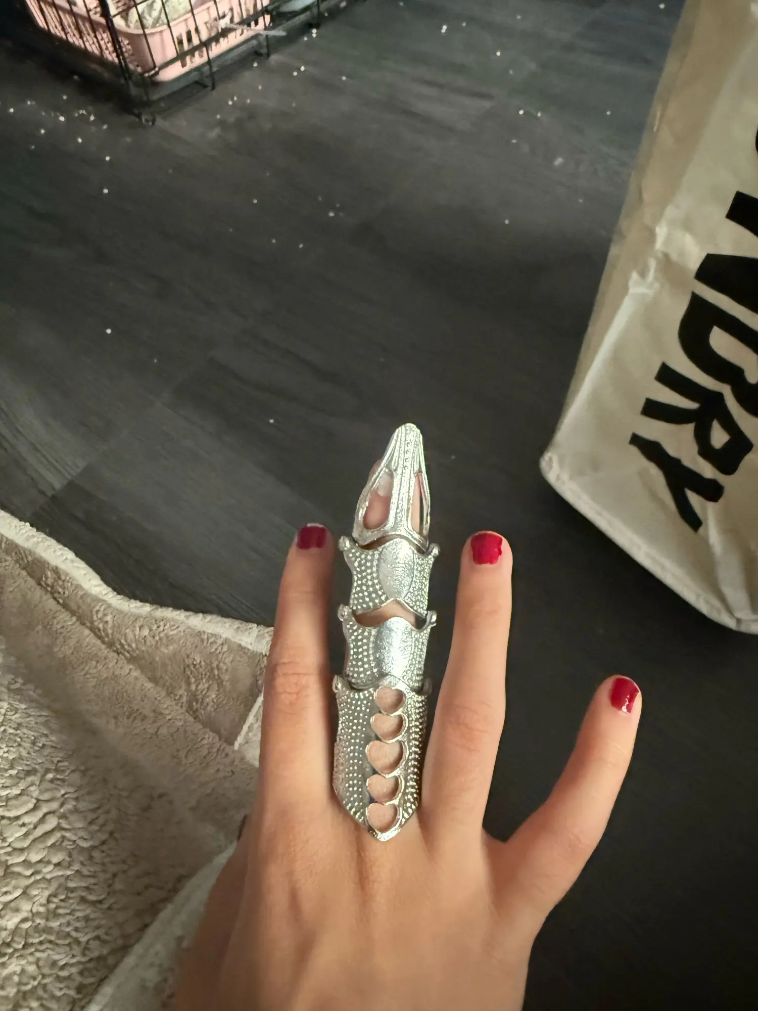 Hinged full-finger ring system designed for cosmetic, full-length digital coverage. Units are worn over the distal and medial phalanges and are characterized by a segmented, metallic carapace aesthetic.